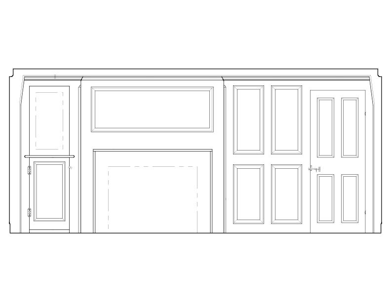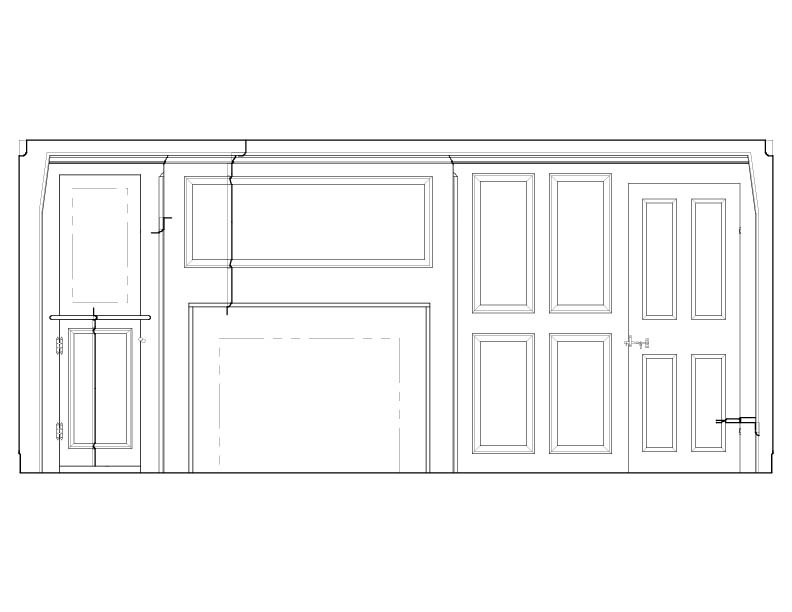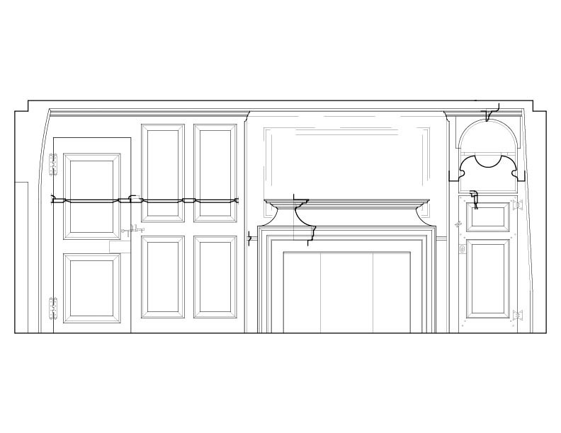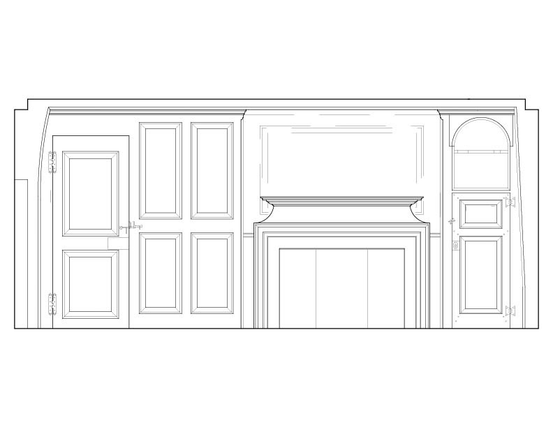 Measured drawings of the paneled room reveal a deliberately organized interior. Full height paneling, proportioned openings, and a hierarchy of mouldings define the walls, fireplace, and doorways. Cornices, architraves, and panel trim share related profiles, guiding the eye around the room and creating a quiet sense of architectural order.