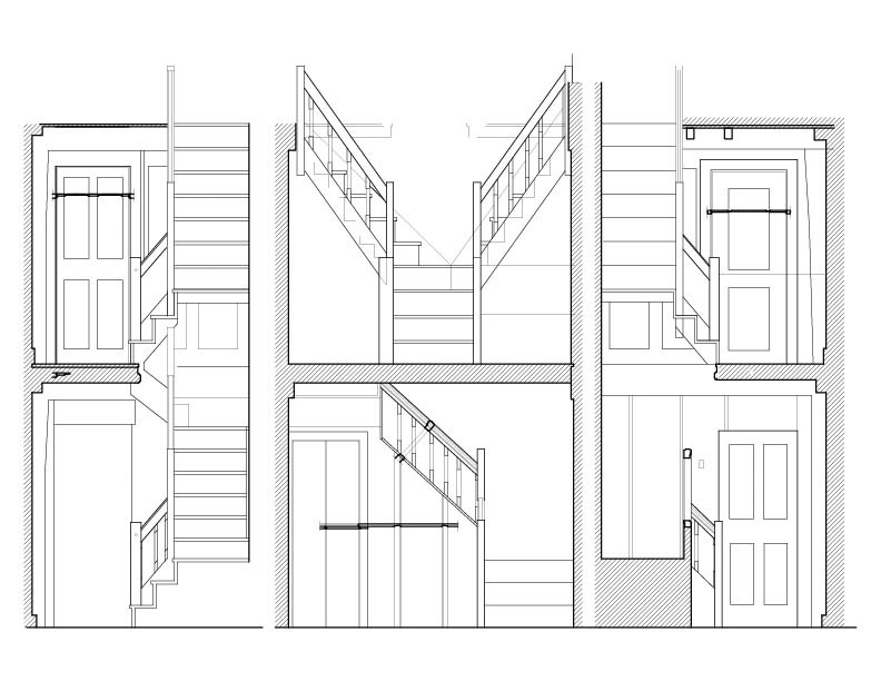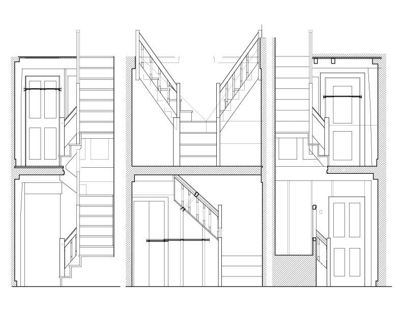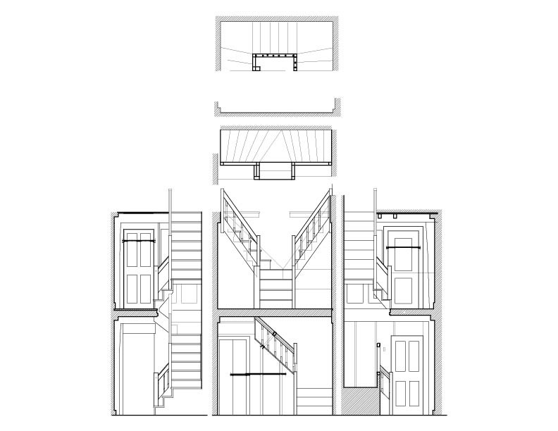The staircase documentation is equally revealing. Elevations and sections capture the relationship between tread, riser, stringer, and handrail with clarity, showing how geometry and joinery work together in the service of movement. The stair profiles echo the language of the wall paneling, uniting circulation and enclosure within a single, cohesive design.