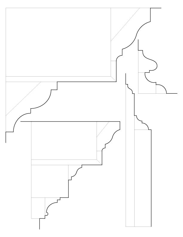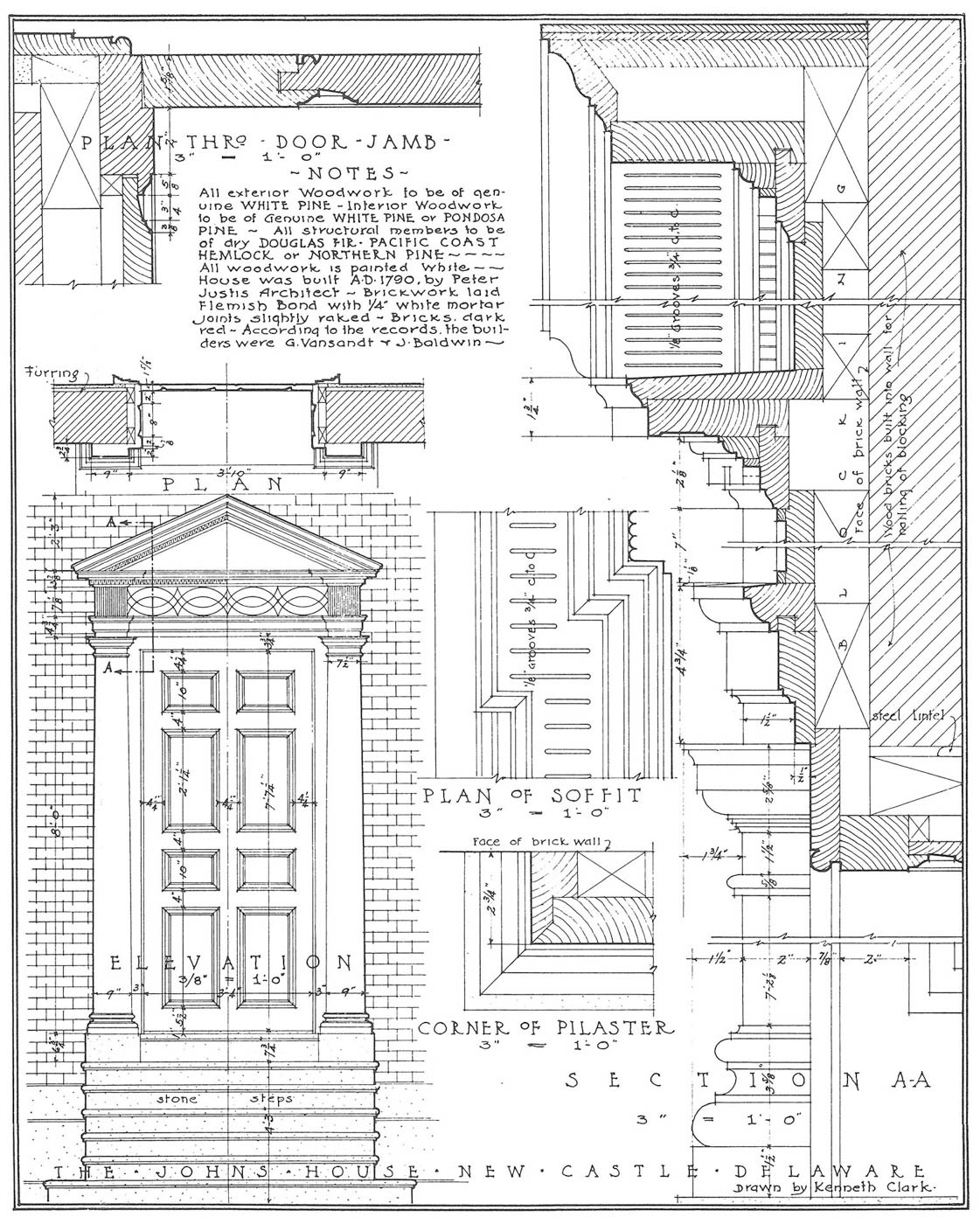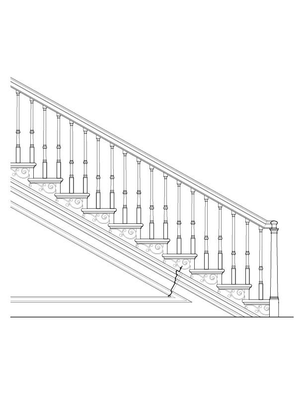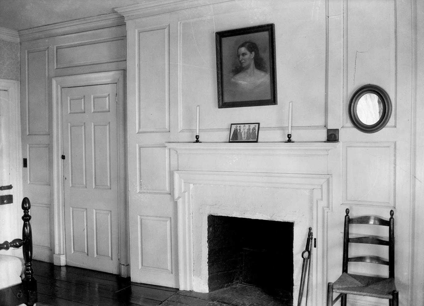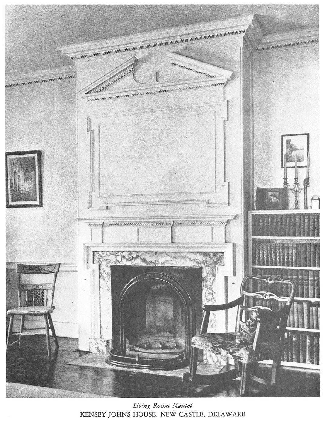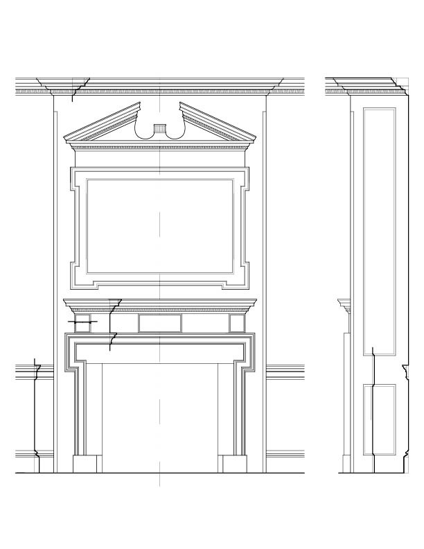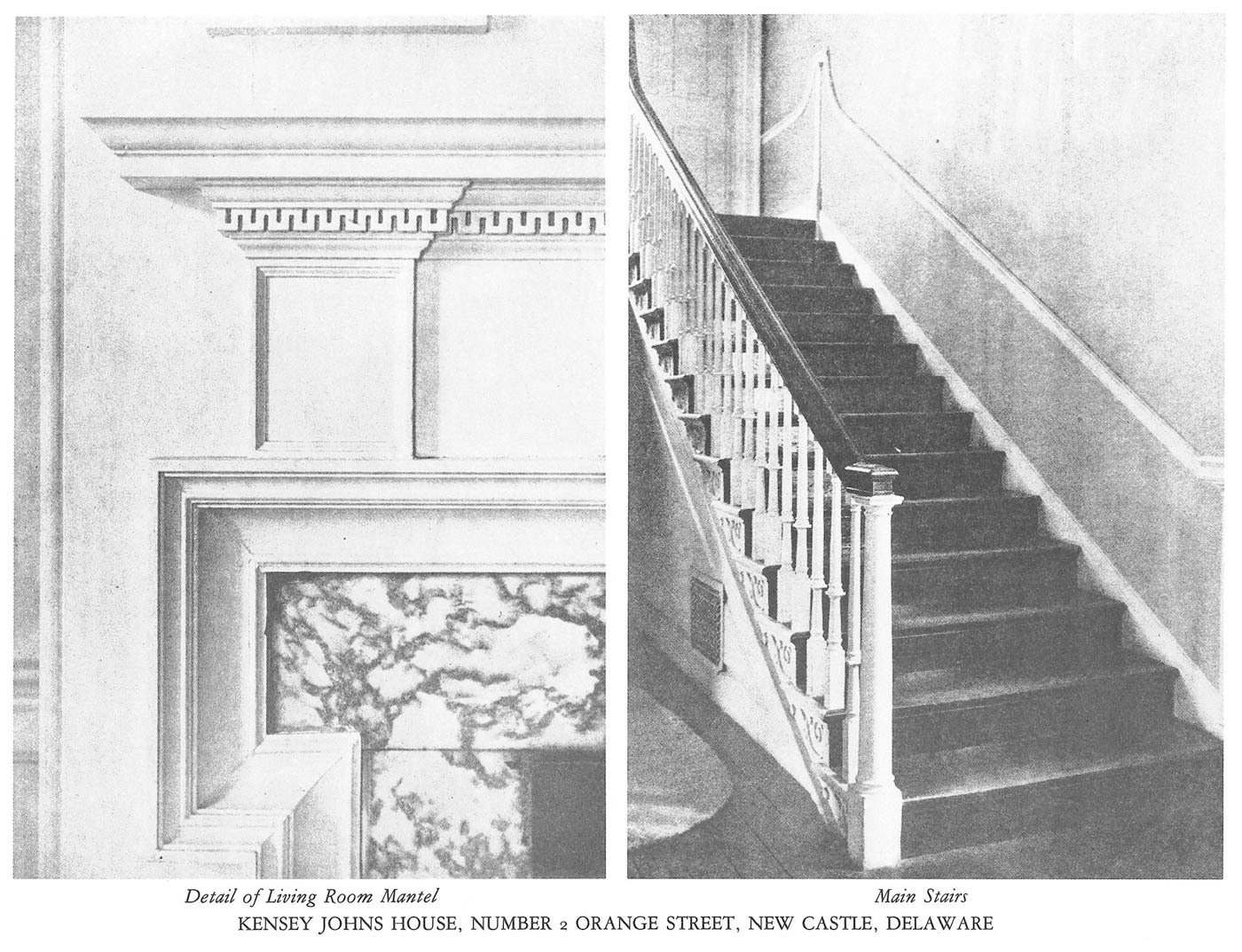 The house reveals a progression of spaces enriched by finely executed millwork, as documented through surviving photographs and measured drawings. Principal rooms are framed by crisply detailed door and window surrounds, their profiles creating depth through light and shadow rather than ornament alone. Mantels and interior cornices employ classical motifs with discretion, while the stair hall introduces a quiet sense of movement through its balanced balustrade and finely shaped newel. Throughout the interior, craftsmanship and design intent remain closely aligned, producing rooms that feel deliberate yet unforced.